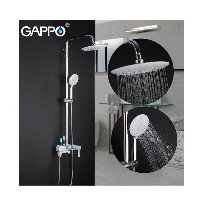 Gappo G2402-8 имеет регулируемую по высоте штангу (800-1500 мм), верхняя часть которой оборудован тропическим душем диаметром 235 мм. Также в комплекте присутствует шланг, трехрежимная душевая лейка и регулируемый держатель для нее.