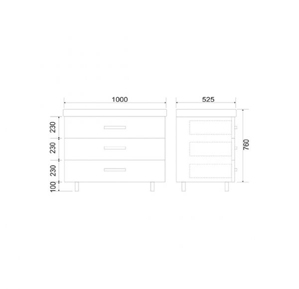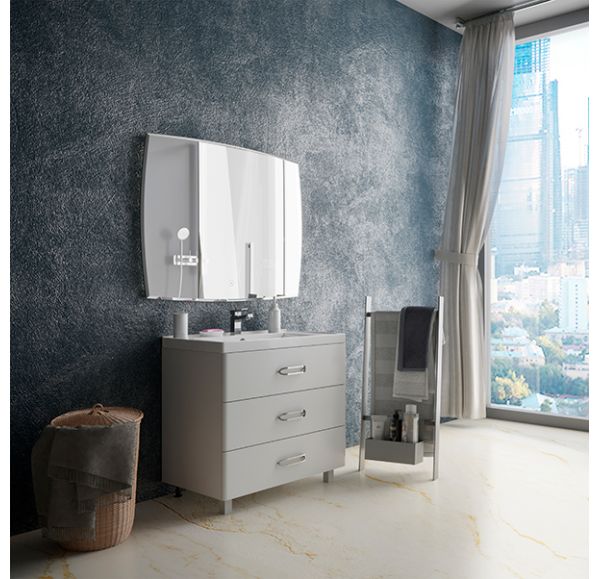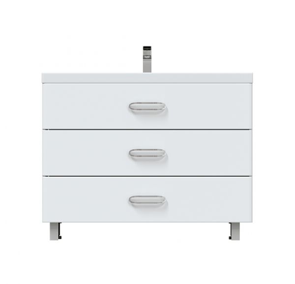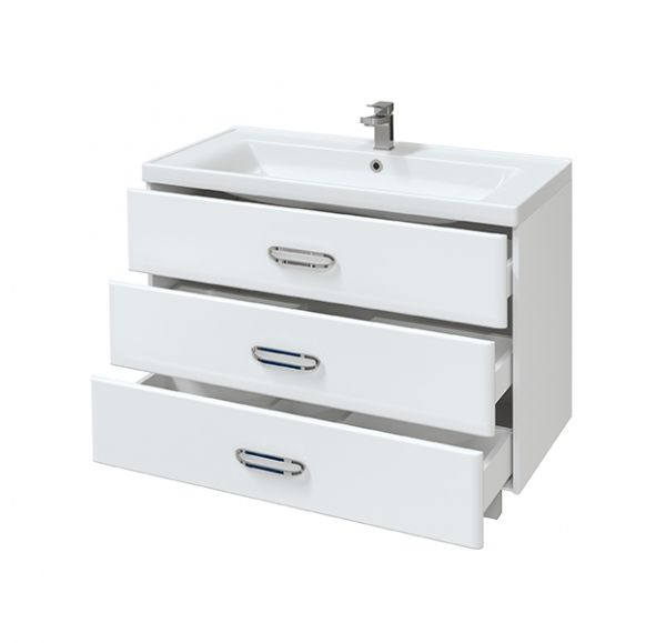Тумба для ванной комнаты оснащена тремя вместительными ящиками полного выдвижения и встроенными доводчиками.