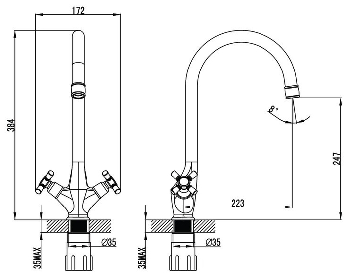 Назначение: для кухни; Тип смесителя: двухвентильный; Форма излива: дугообразный; поворотный излив; Запорный клапан: керамический; Тип монтажа: настольный (горизонтальный); Подвод воды: Подвод воды: шланги; Покрытие корпуса: хром; Высота смесителя (мм): 384; Высота струи (мм): 247; Глубина струи (мм): 223