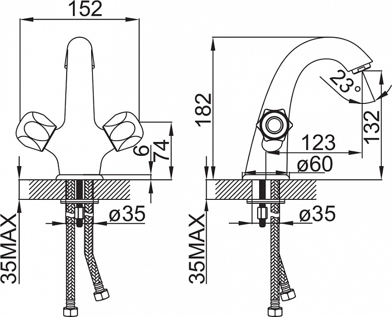 Назначение: для умывальника; Тип смесителя: двухвентильный; Форма излива: дугообразный; Страна происхождения бренда: Россия; Запорный клапан: керамический; Тип монтажа: настольный (горизонтальный); Подвод воды: Подвод воды: шланги; Покрытие корпуса: хром; Высота смесителя (мм): 182; Высота струи (мм): 132